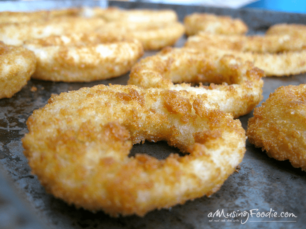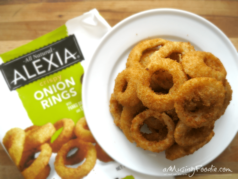 Alexia Onion Rings with Panko Breading and Sea Salt are super easy to prepare. As in, lay the onion rings in a single layer on a cookie sheet and bake them for less than 20 minutes, with one flip right in the middle. Crispy and delicious!